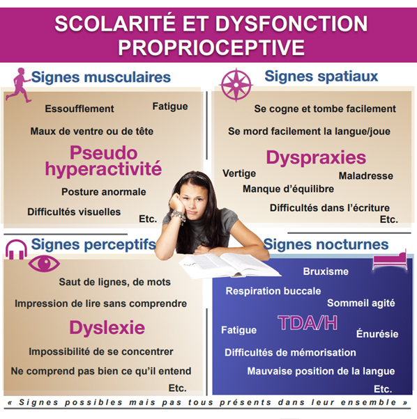 La proprioception, souvent appelée 6ᵉ sens, permet au cerveau de connaître en permanence la position, le mouvement et la force des différentes parties du corps. Une dysproprioception, ou mauvais traitement de ces informations, peut provoquer maladresse, troubles posturaux, fatigabilité, difficultés motrices et scolaires, et contribuer à des troubles « dys » (dyspraxie, dysgraphie, dyslexie, TDAH…).